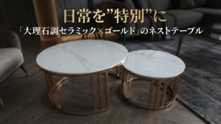 PERSI☆WOODのネストテーブルの魅力を解説。「傷・汚れ・熱に強いセラミック天板」「広げる・分ける・重ねる自在なネスト機能」「洗練されたゴールドの輝き」の3つの推しポイントを紹介。使い勝手の良さとデザイン性の高さをお伝えします。